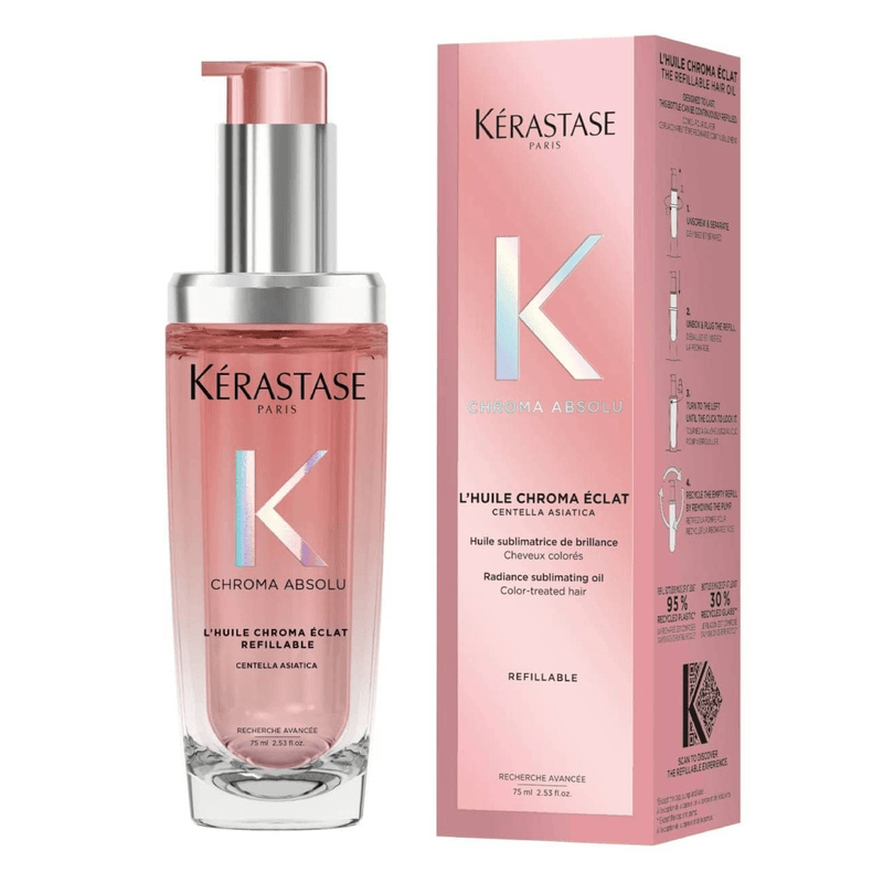 Kérastase L’Huile Chroma Éclat Radiance 75 ml es un aceite capilar ligero diseñado para realzar el brillo, suavizar y proteger el cabello coloreado. Su fórmula potencia la luminosidad del color, controla el frizz y aporta nutrición sin dejar sensación grasa.